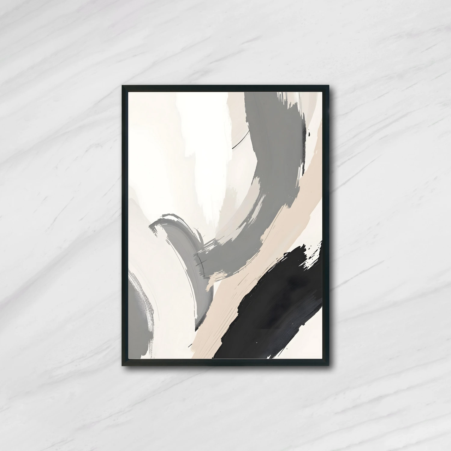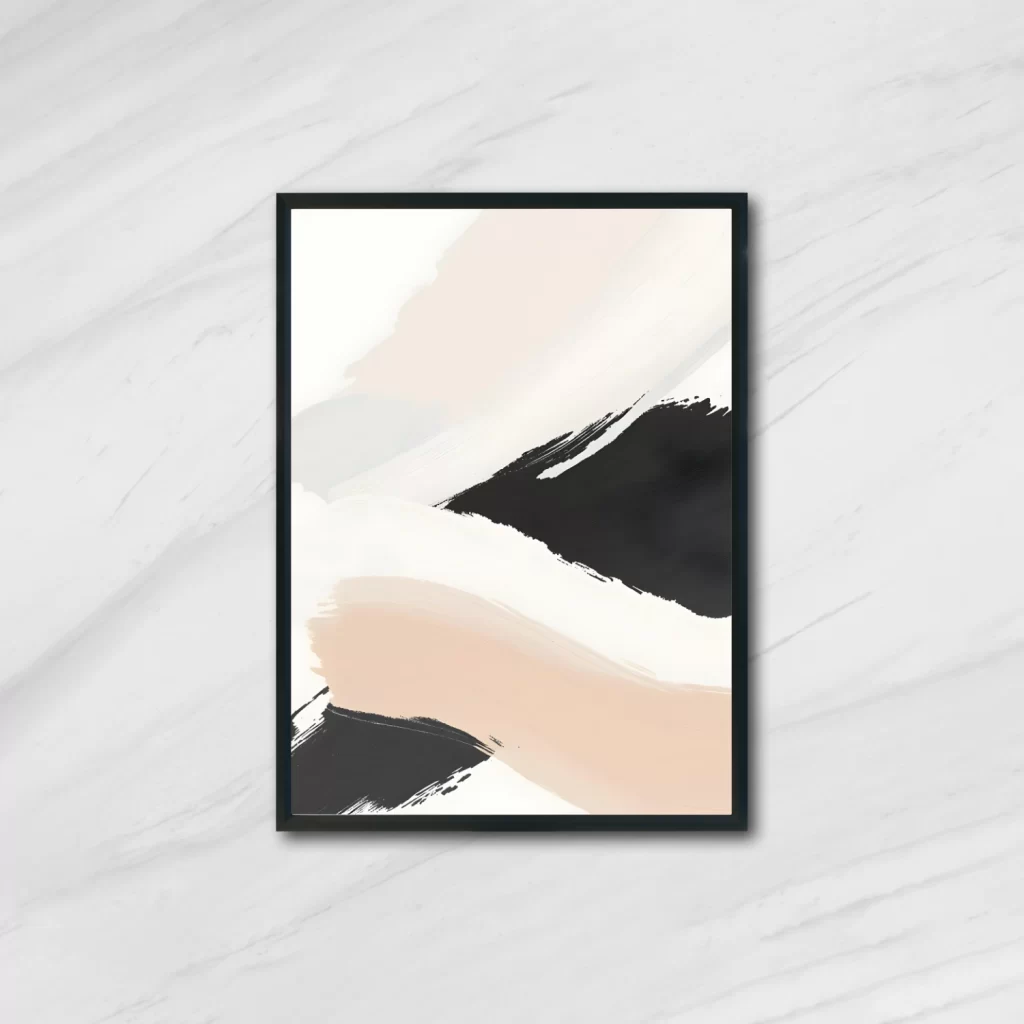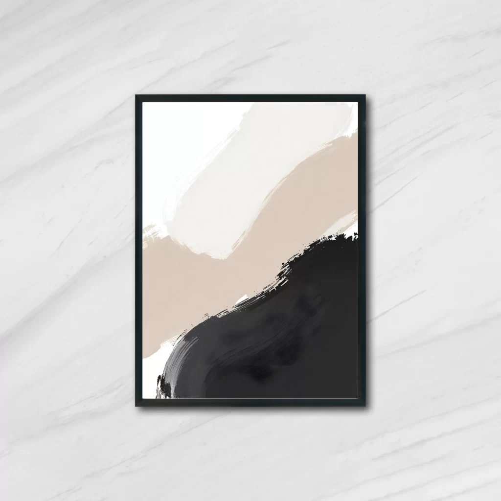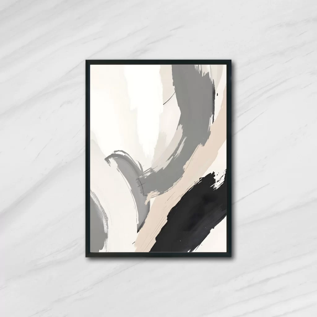 Shadow Flow blends flowing strokes in charcoal black, warm gray, and soft off-white to create a minimalist yet impactful aesthetic. The clean backdrop enhances the moody elegance of the palette, making it ideal for modern homes, gallery walls, or design-forward workspaces.